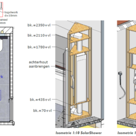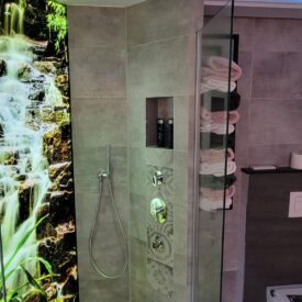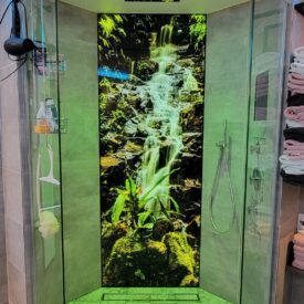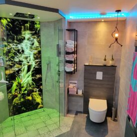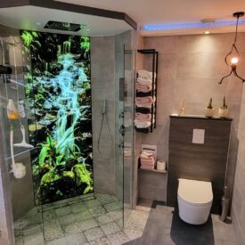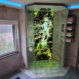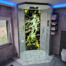 Het oog van de bezoeker valt al direct bij binnenkomst, op de royale inloopdouche. Door de douchecel 45 graden te draaien, ontstaat er een symmetrieas over de diagonaal van de ruimte. De vorm van de douchecel, het verlaagde plafond, de glazen wanden en de afwijkende vloertegels, versterken deze symmetrie en trekken het oog naar het hoofdelement: het verlichte glazen fotopaneel achter in de douche.