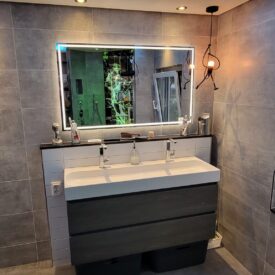 De badkamer is uitgerust met slimme verlichting. Door te spelen met verschillende lichtbronnen, intensiteit en kleurtemperaturen is het mogelijk in een handomdraai de sfeer van de badkamer om te toveren van alledaags en functioneel tot luxe spa. Het licht uit de verschillende kleurenspots in het plafond van de douche, mengt zich met de waterstraal van de ingebouwde regendouche. De spots in de plafondkoven zijn uitgelegd om specifieke details en symmetrie te benadrukken.