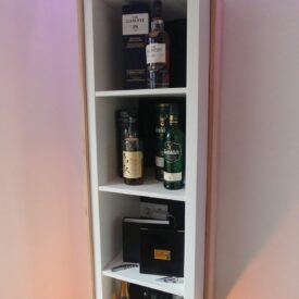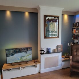 Zo kon ook de al bestaande schouw eenvoudig opgenomen worden in het totaal ontwerp van de televisiewand.