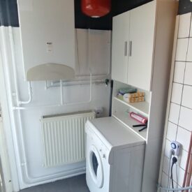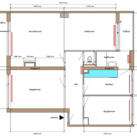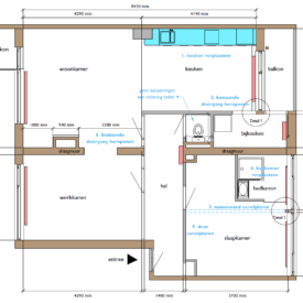 Doordat de badkamer verplaatst werd naar de andere zijde van de wand, kwam er in de oorspronkelijke badkamer ruimte vrij om een bijkeuken te realiseren en is het balkon op het oosten direct vanuit de keuken te bereiken zonder eerst door de badkamer te moeten.