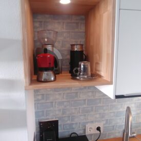 Zo komt hetzelfde blanke beukenhout dat gebruikt is in de woonkamer, door de gehele woning terug in accenten, zoals een koffie-kastje boven het aanrecht, de dagkantafwerking van de doorgang naar de bijkeuken of de afwerking van de kapstok.