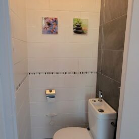 Voor het kleine toilet (ca. 90 x 90cm) heb ik een bladzijde geleend uit het boek voor Tiny-Houses: het toilet met ingebouwd fonteintje hergebruikt het water waarmee men de handen wast en dat bespaart naast water ook veel ruimte. Zo is van een zeer klein toilet toch een functioneel en duurzaam toilet gemaakt.