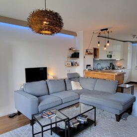 De woonkamer is open en luchtig ingericht in een op het Scandinvisch geïnspireerde stijl. De radiatorombouw is voorzien van een verdiepte vensterbak van blank beukenhout. Door vervolgens met verschillende soorten licht te spelen ontstaat en dynamisch en uniek geheel.