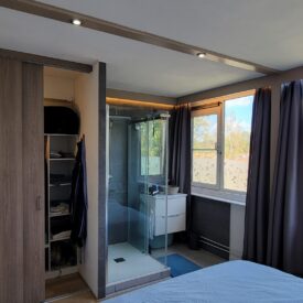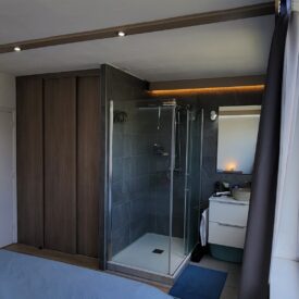 De slaapkamer en de oorspronkelijke keuken kunnen nu samengevoegd worden, tot een grote slaapkamer met inloopkast en een ensuite badkamer. De inrichting van de badkamer is zo gekozen dat deze in de toekomst tot aparte ruimte omgebouwd kan worden, door de oude wand eenvoudigweg op dezelfde plek terug te plaatsen. Zo kan van dit ruime tweepersoons appartement een kleine gezinswoning gemaakt worden.
